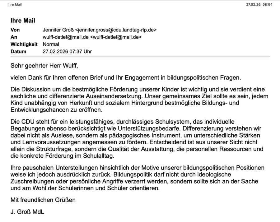 An Frau Jennifer Groß - mit Antwort von ihr.